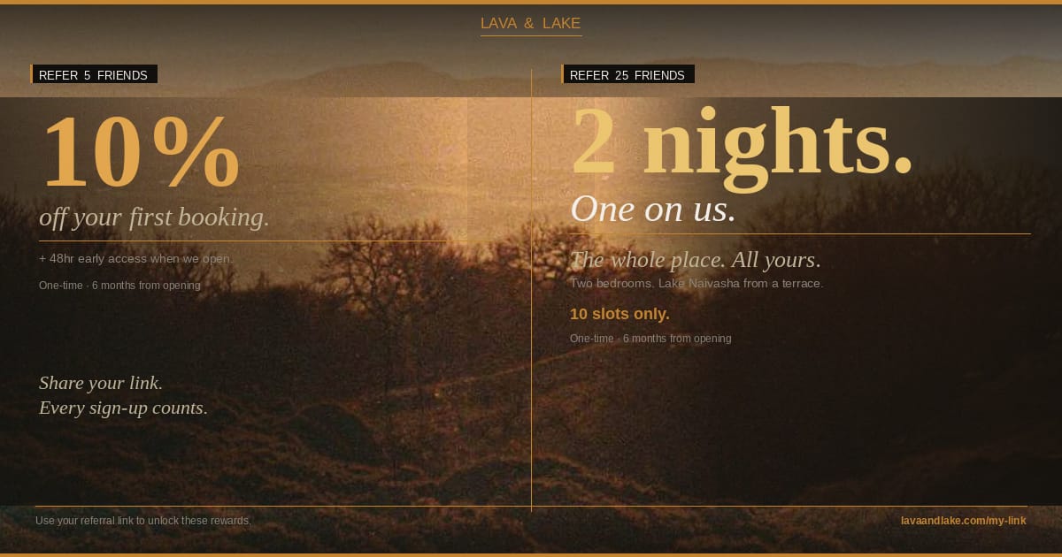 Share your link with five people who'd appreciate this. When they sign up, you get 10% off any booking you make at Lava & Lake. Get 25 people on board and we'll give you a free night on us ,on the house, literally, once it has one. 😜